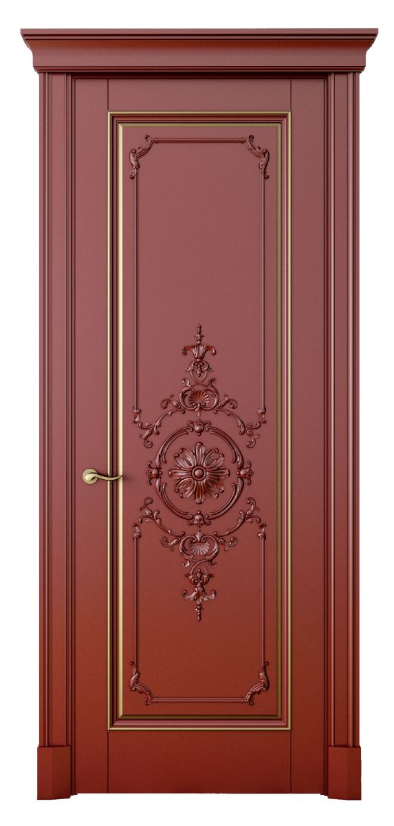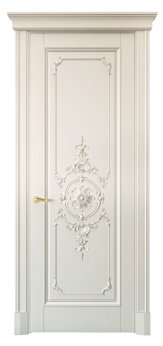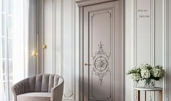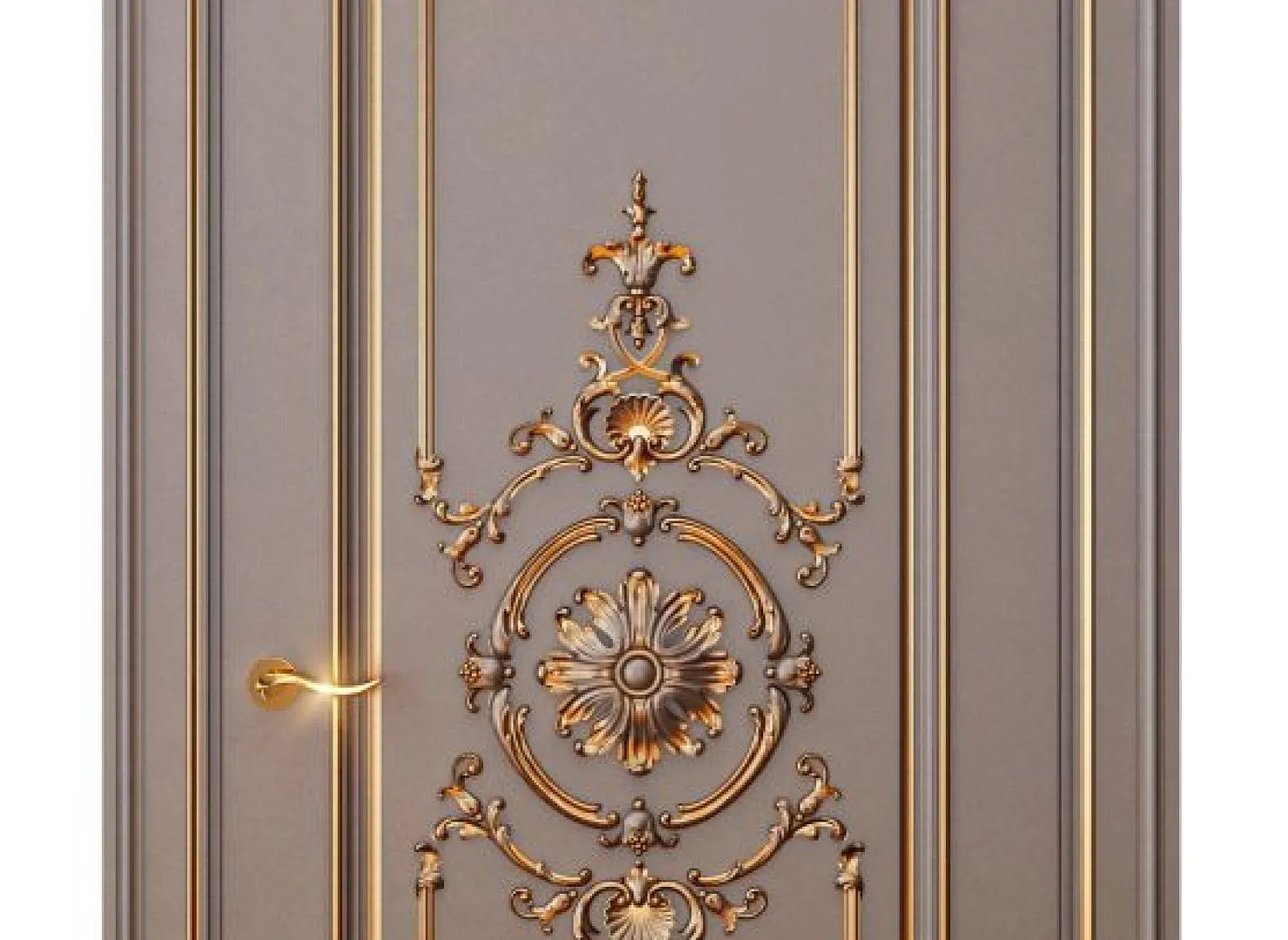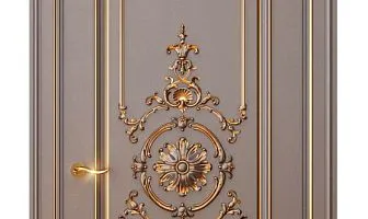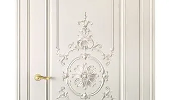 A round rosette is located at the center of the door panel, framed by an exquisite composition of stylized floral patterns and shells. Elegant corner elements, connected by delicate moldings, complete the design and create a unified decorative ensemble.
