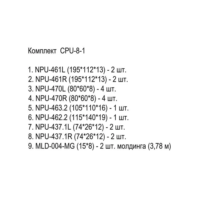 The CPU-8-1 kit creates a vertical decorative panel with overall dimensions of 430 × 2300 mm and a maximum relief depth of 19 mm—the central medallion NPU-462.2. Full component composition: primed MDF molding MLD-004-MG, profile 15 × 8 mm, length 2600 mm—one unit; polyurethane molded decor NPU-461L, size 195 × 112 × 13 mm—one piece; polyurethane molded decor NPU-461R, size 195 × 112 × 13 mm—one piece; polyurethane molding NPU-437.1L, size 74 × 26 × 12 mm—one piece; polyurethane molding NPU-437.1R, size 74 × 26 × 12 mm—one piece; polyurethane molded decor NPU-462.2, size 115 × 140 × 19 mm—one piece; polyurethane molded decor NPU-463.2, size 110 × 105 × 16 mm—one piece; polyurethane molded decor NPU-470L, size 80 × 60 × 8 mm—one piece; polyurethane molded decor NPU-470R, size 80 × 60 × 8 mm—one piece. Total: nine individual items across nine nomenclature positions. All ornamental polyurethane elements are supplied with factory white acrylic primer. MDF molding—with 'Prestige' primer (detailed manual sanding). Material of the supporting molding—medium-density fiberboard (MDF). Material of ornamental decors—high-density rigid polyurethane.