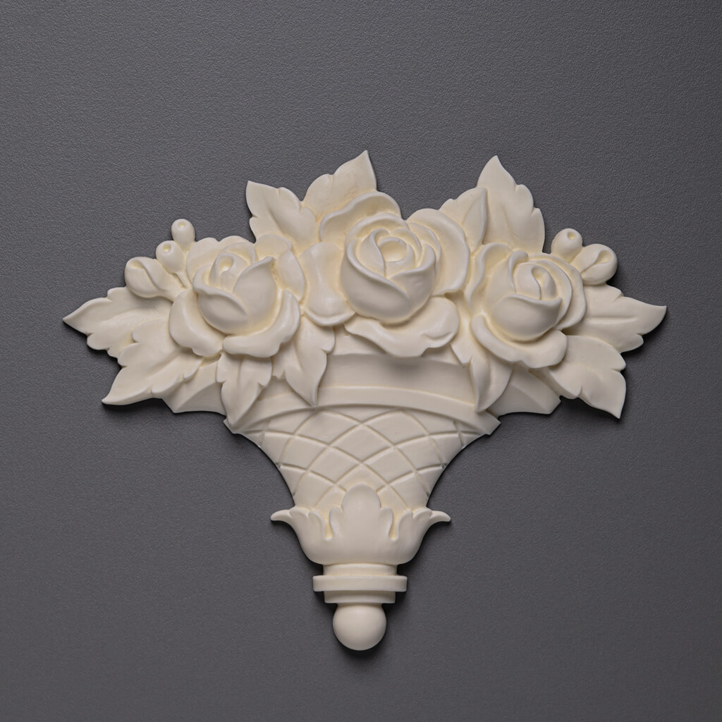 Relief Decoration NPU-462.2 This is a detailed, durable, and lightweight polyurethane applique from the manufacturer. The item is shaped like a basket with a volumetric bouquet of roses, leaves, and decorative elements, creating an expressive relief and clear contours. The material is moisture-resistant, temperature-resistant, suitable for both interior spaces and facades.