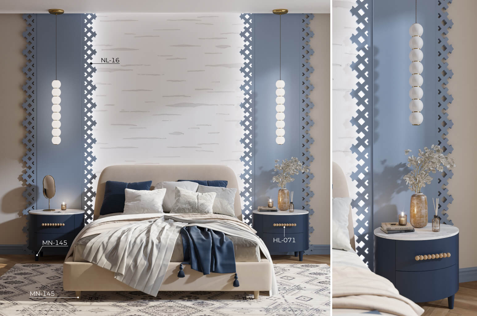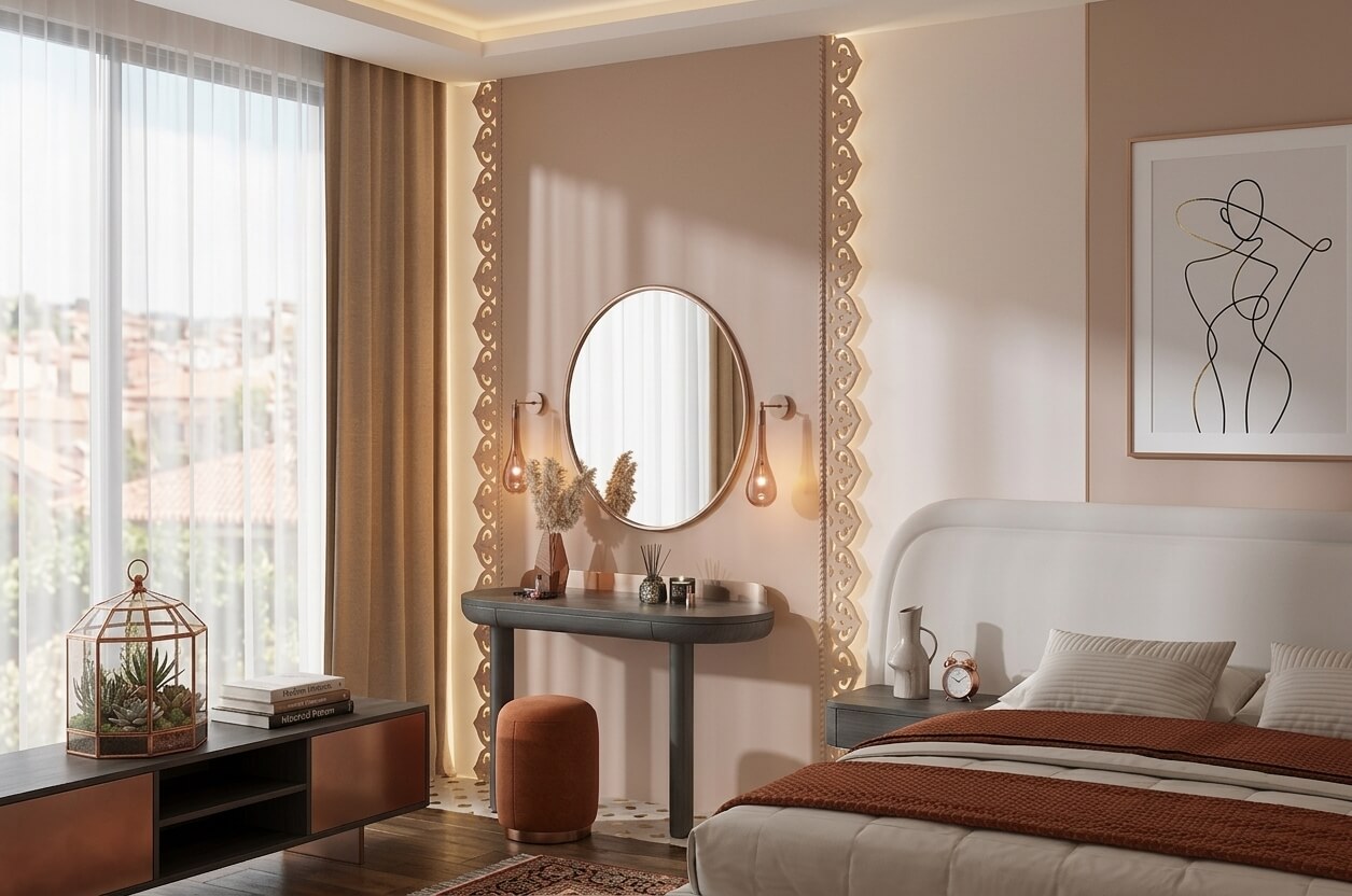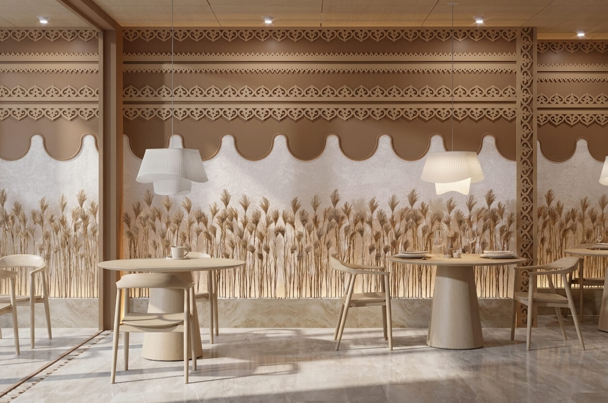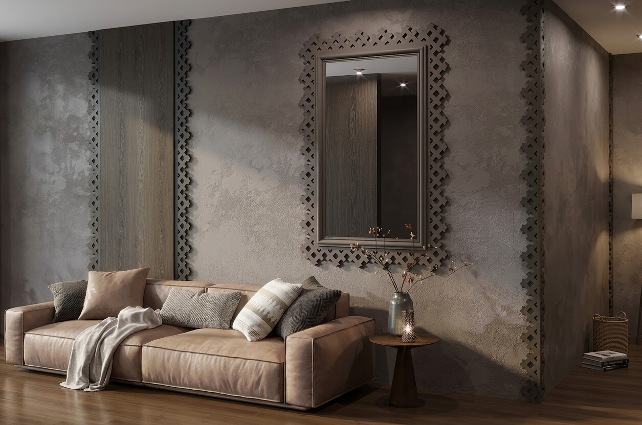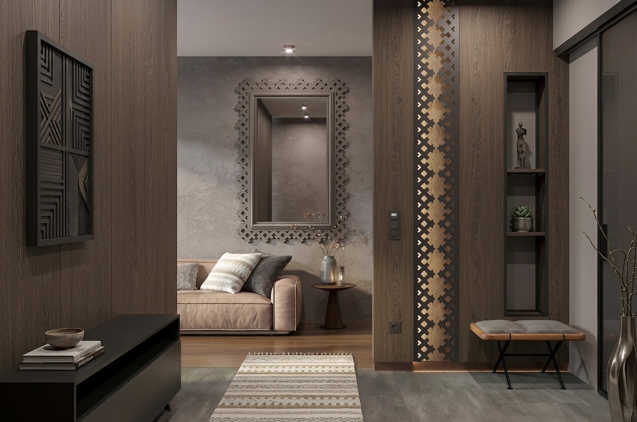 The project can be enhanced with complementary elements featuring 2D patterns: delicate corner brackets, central overlays, elegant brackets, or small carved details.