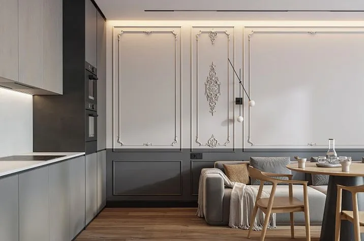 Vertical moldings, pilasters, and decorative panels are used to visually divide open-plan spaces into functional zones. This solution does not clutter the room with partitions, preserving the feeling of spaciousness and freedom.