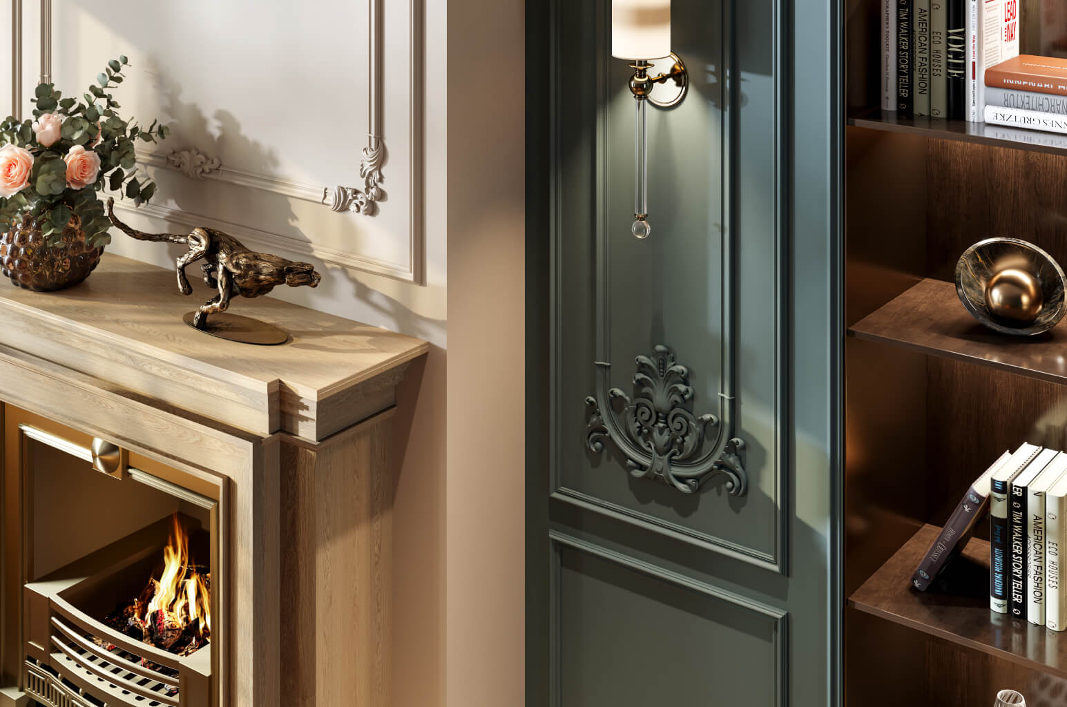 In a classical interior, it is characteristic to use wall panels framed by moldings, pilasters with capitals, rosettes, and decorative appliqués with vegetal motifs. Symmetrical composition, proportional elements, and rich ornamentation create an atmosphere of solemnity and luxury.