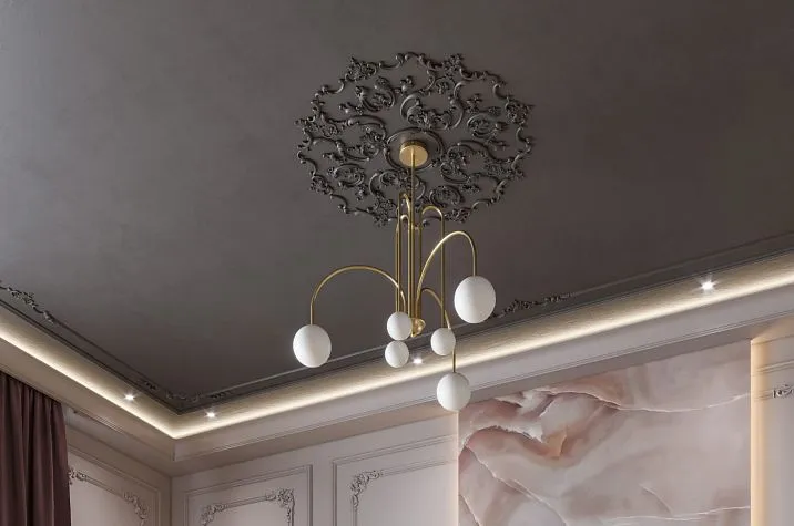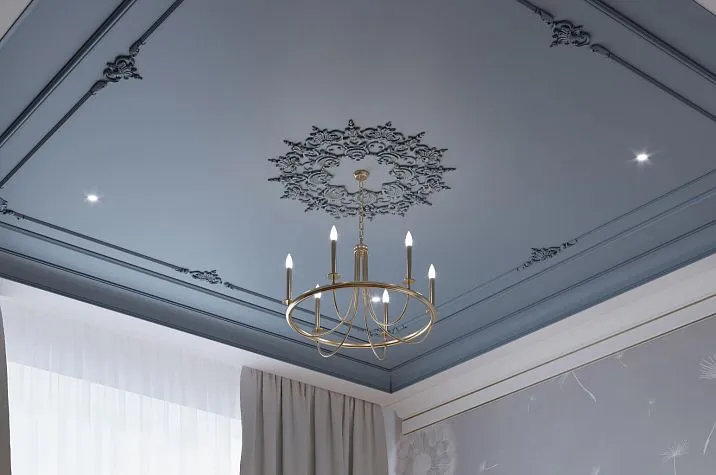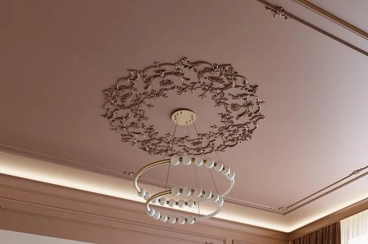 Special attention should be given to the use of rosettes with stretch ceilings. The installation technology through embedded elements allows integrating decor into the stretch structure without compromising the integrity of the fabric. The lightweight nature of polyurethane eliminates deformation of the stretch ceiling.