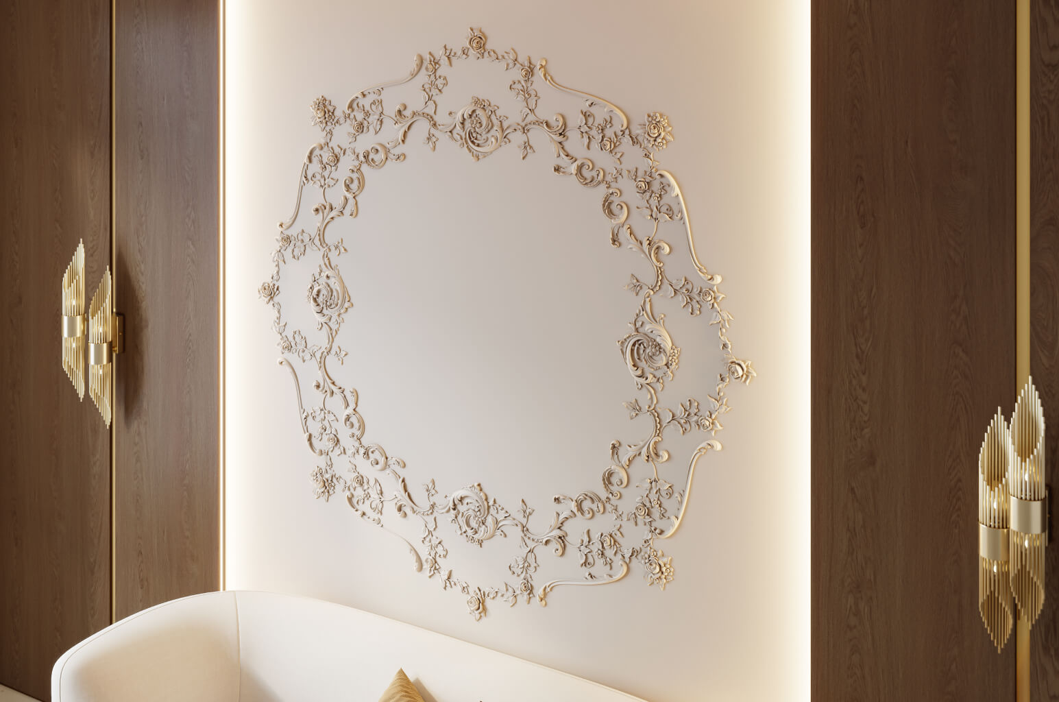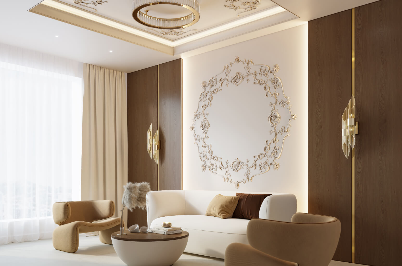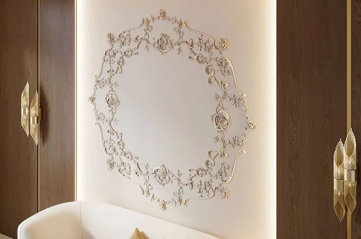 Ceiling rosette for chandeliers STAVROS seamlessly integrates into any interior style. This is possible due to the variety of design solutions. In classical interiors, rosettes with botanical ornaments harmoniously combine withceiling moldings, creating a unified architectural ensemble.