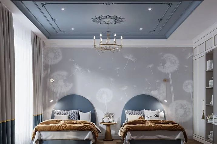 Ceiling stucco decorIn a children's room — an unconventional but very deliberate choice. A child growing up in a space with thoughtful architectural design perceives beauty as the norm. The CPU-P1 or CPU-P5 ceiling system in a children's room is delicate, concise, not overwhelming the space, but creating a sense of care and attention to detail.