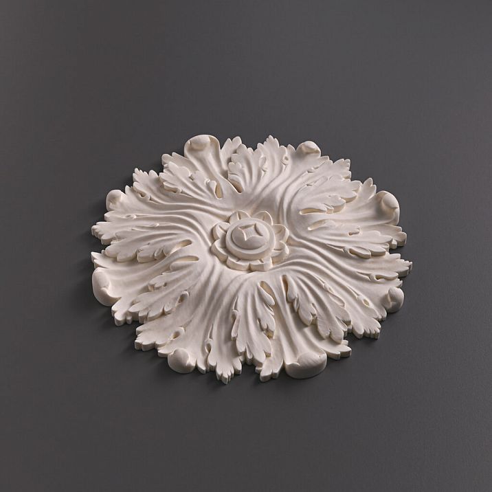 The design of the carved rosette RPU-044 is rooted in the best traditions of classical aesthetics, capable of adding grandeur and luxury to any space. This makes it an indispensable element for creating an atmosphere of majesty and elegance not only on ceilings but also as decoration for furniture or doors.