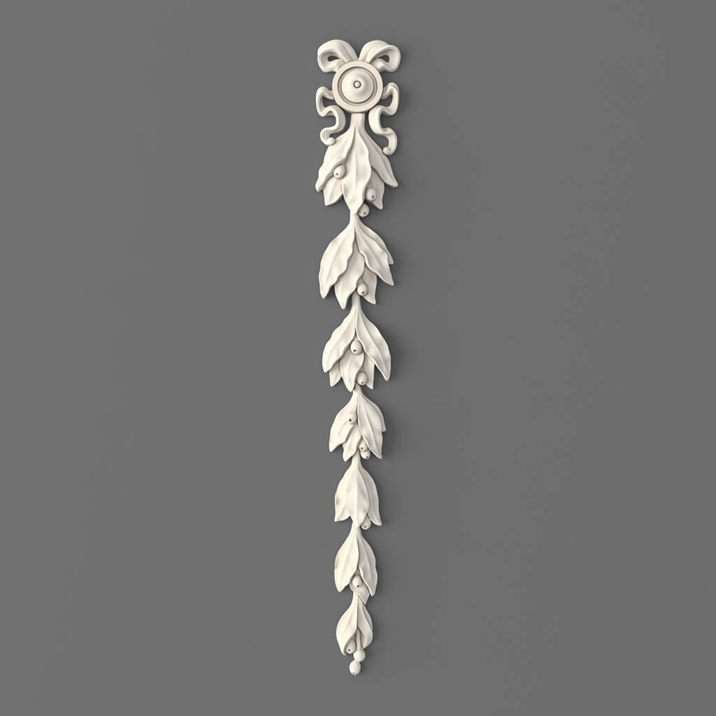 NPU-498 fully meets these requirements. The product is an elongated vertical element with a floral ornament—an elegant composition of leaves that unfolds along the entire length of the profile. A height of 307 mm with a width of only 41 mm makes it exactly what is called a 'narrow decorative overlay'—not a dominant feature, not a central motif, but an accent, a refinement, a finishing touch. The 11 mm thickness ensures a well-defined relief: enough for the ornament to look three-dimensional, yet not so much as to create mechanical inconvenience during installation or use.