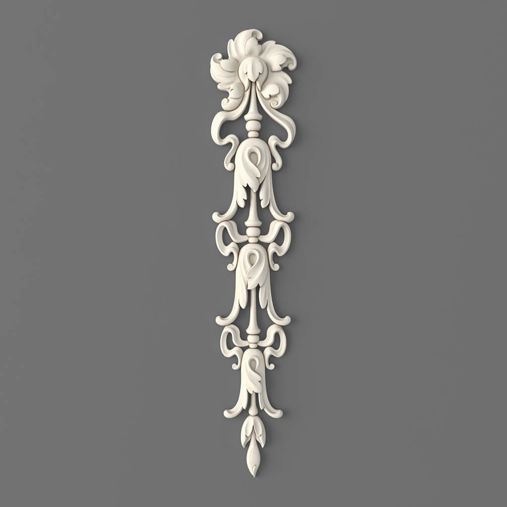 The expressive vertical format with a floral ornament—a symmetrical, complete, legible composition—creates a visual impact proportionate to the task: it doesn't overwhelm, but it doesn't get lost either. Dimensions of 58 × 300 × 11 mm ensure proportionality to typical furniture and door objects: the proportions work without additional calculations. Polyurethane as a material guarantees precision of the pattern, resilience under mechanical impact, resistance to household conditions, and ease of installation with adhesive without special tools. The primed surface is ready for final painting immediately.