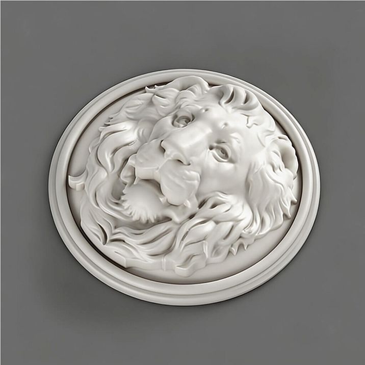 The carved mascaron MPU-002 is a decorative applique in the shape of a lion, made from high-quality polyurethane, designed to decorate furniture, doors, or walls. It is placed in a prominent position and serves as an accent in the overall interior composition. The item is crafted with high precision and attention to detail, making each relief impression clear and refined.