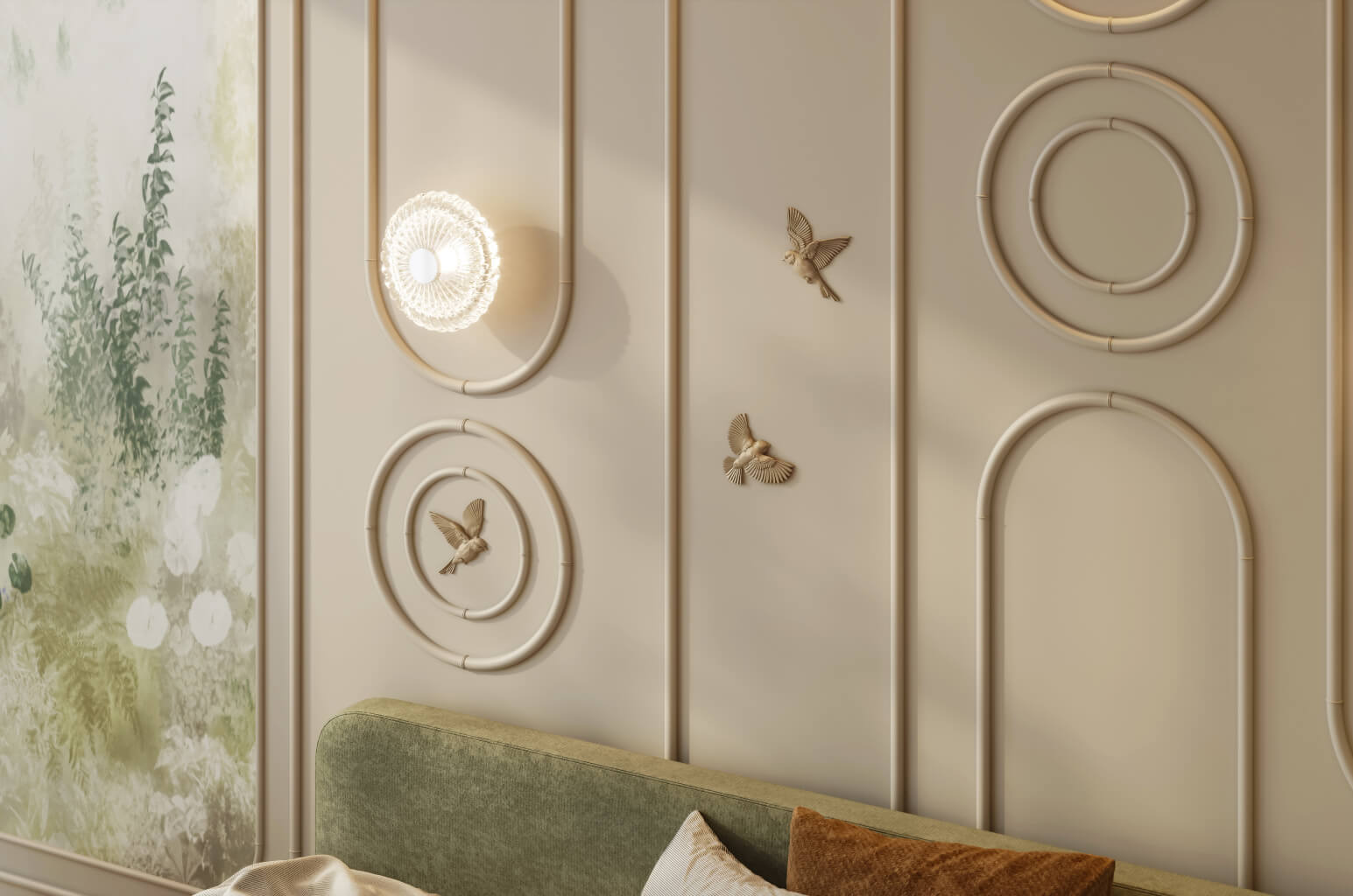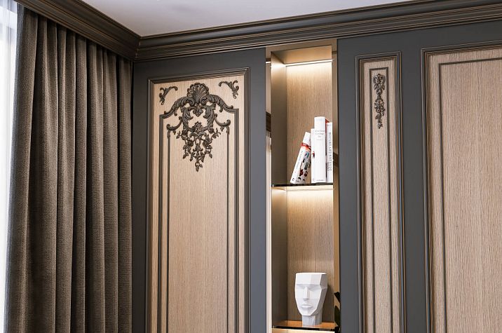 Art Deco style combines luxury with geometry and symmetry. Panels with geometric relief, moldings with angular profiles, decorative elements in the form of zigzags, steps, and sun rays are used. Vertical compositions are characteristic, emphasizing the height of the room.