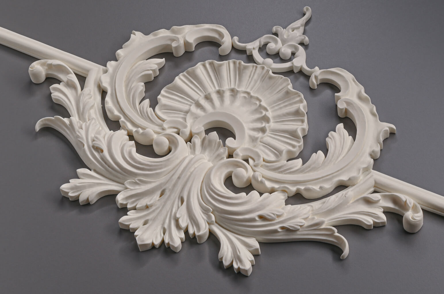 Corner elements are used to decorate interior and exterior corners of a room, connect moldings at right or arbitrary angles. Rosettes – decorative elements of round, oval, or polygonal shape with a three-dimensional ornament – serve as the center of composition on the wall, mounting points for lights, and accents in panels.