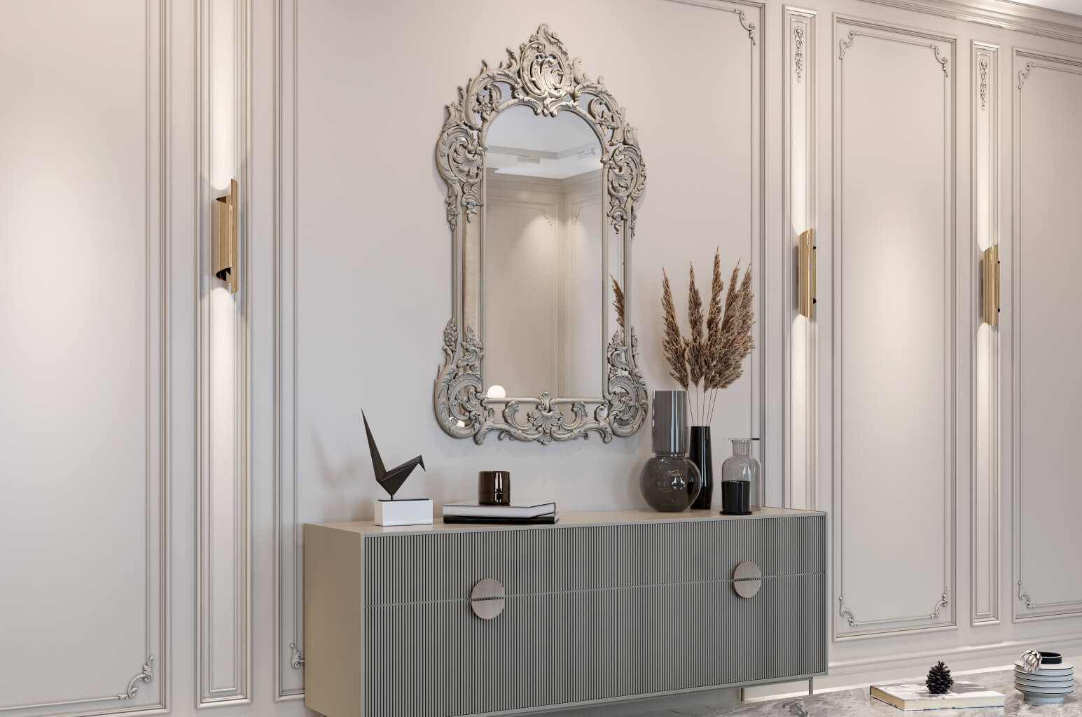 Vertical moldings, pilasters, and decorative panels are used to visually divide open-plan spaces into functional zones. This solution does not clutter the room with partitions, preserving the feeling of spaciousness and freedom.