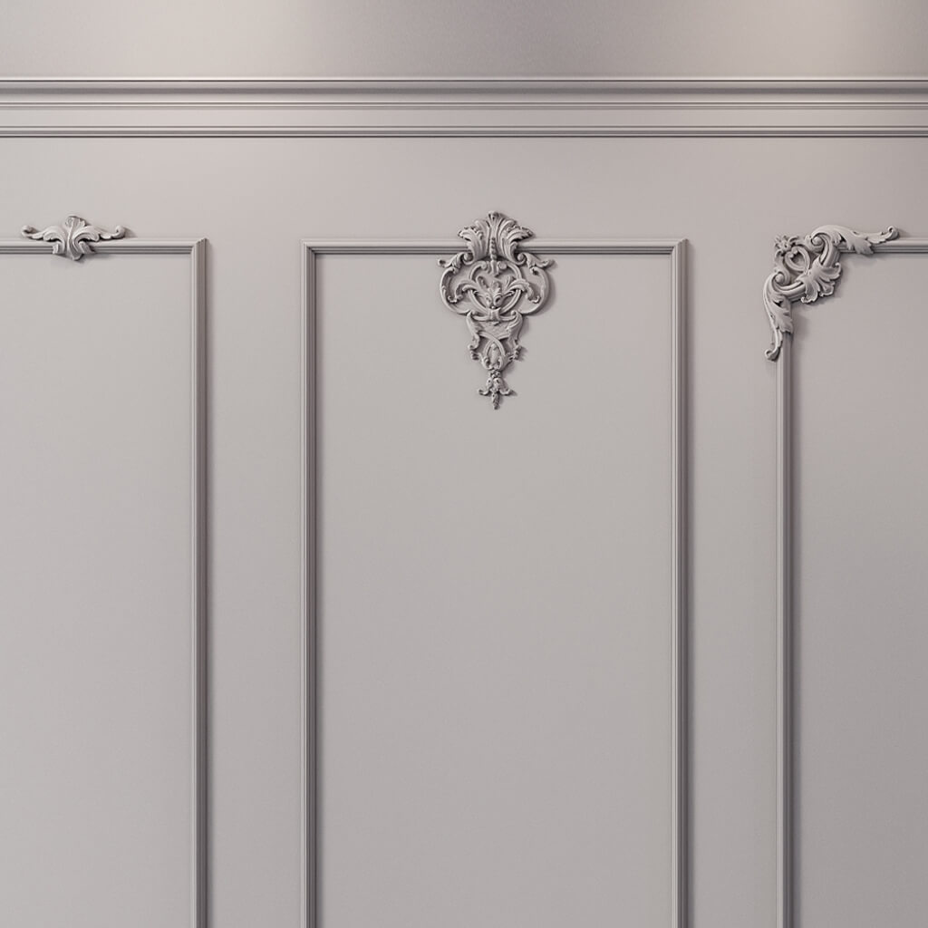 These are two different polyurethane elements in pattern and scale. The top one has a richer relief, is visually more noticeable, and serves as the main decorative accent of the panel. The bottom one is more restrained, finishing. Together they create a vertical hierarchy: beginning, development, completion.