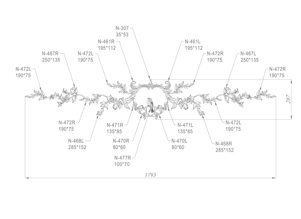 ● Carved applique N-470R - square shape with a carved flower in the center and scrolls along the edges. Suitable for decorating corners of furniture, doors, windows, and other surfaces.