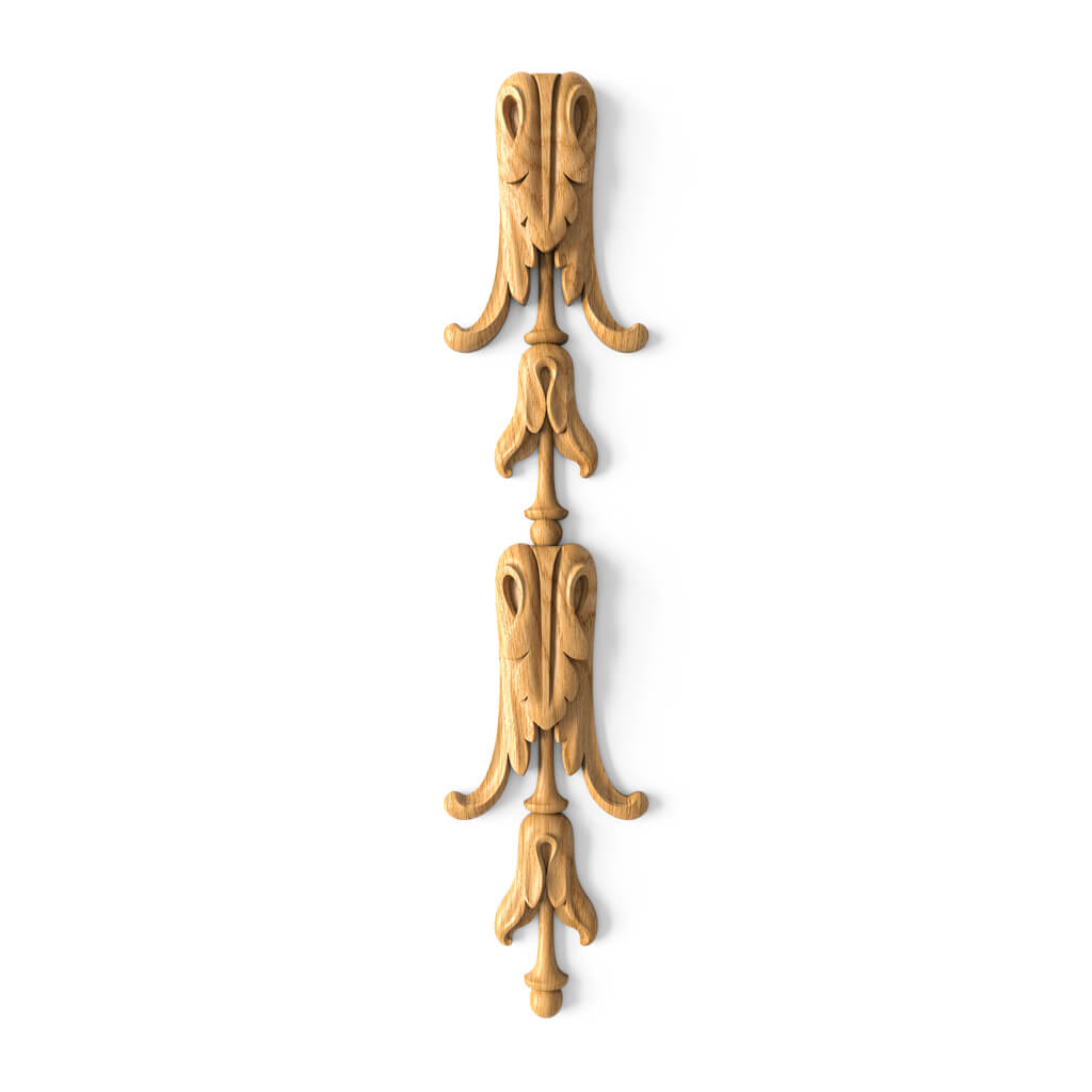 Acanthus is one of the main ornamental symbols of European classicism. It was used on Corinthian column capitals, friezes of ancient temples, and furniture from the eras of Louis XIV and Napoleon.Carved wooden overlay with acanthus in solid oak or beech— is not just a decorative element, it is a direct quote from the language of high classical style. Model N-505 is a three-tier vertical overlay with paired volutes, acanthus petals, and a turned finial — a piece that instantly sets the tone for the entire interior.