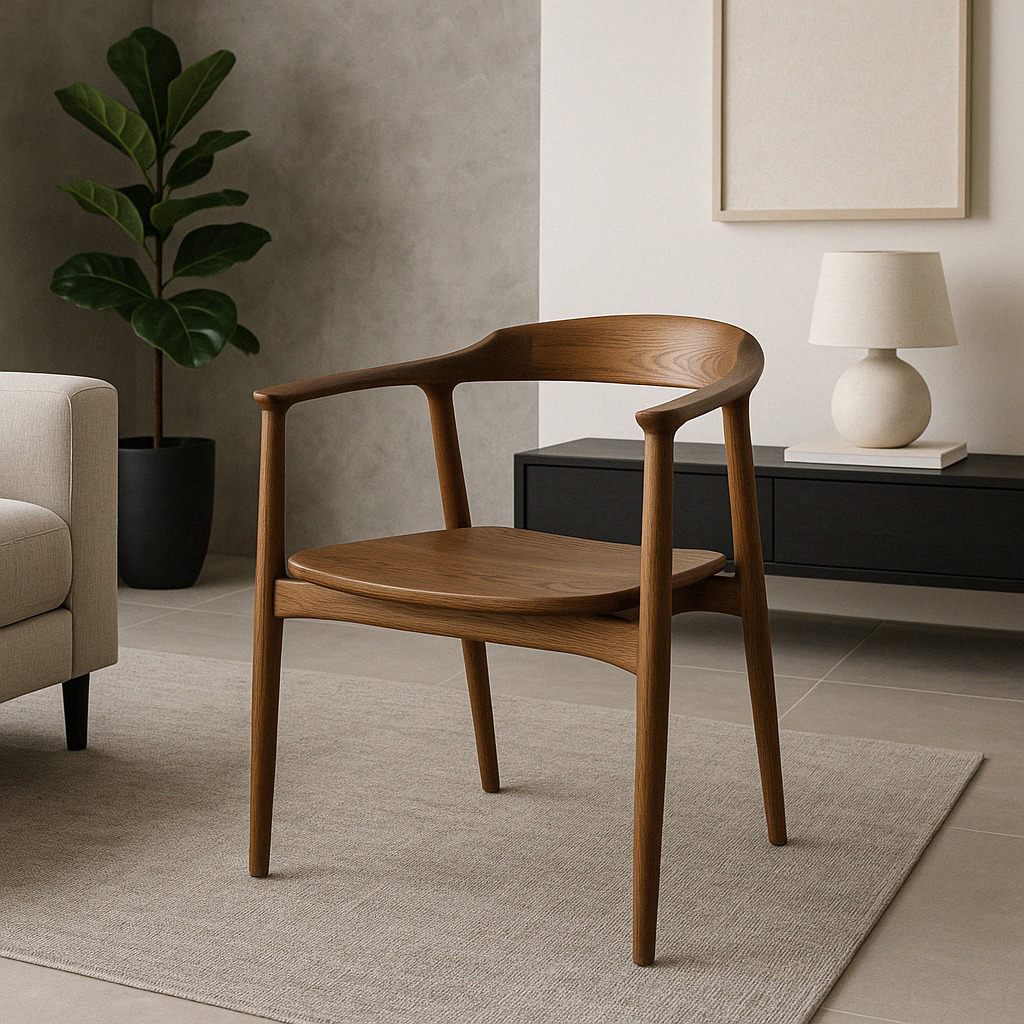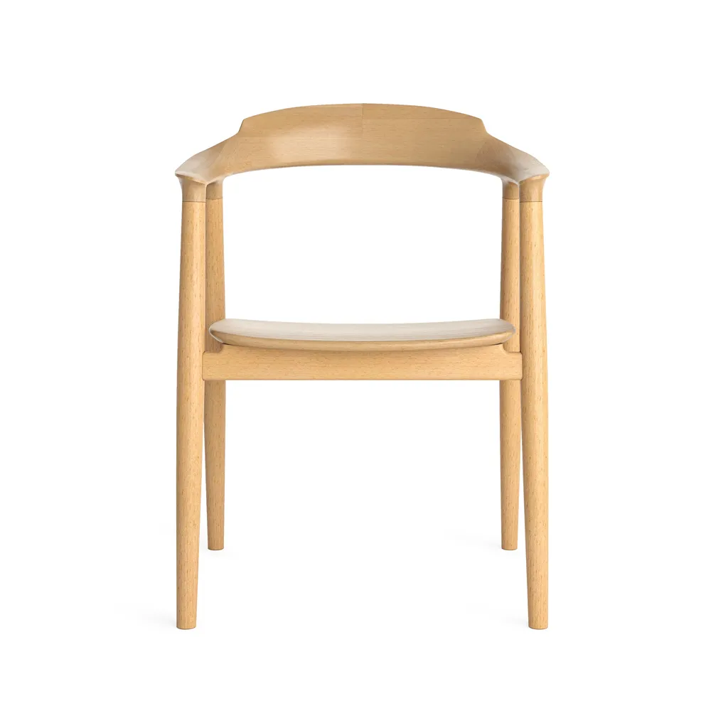 Frame of the chair STU-004 Designed in the traditions of Scandinavian minimalism with an emphasis on functionality and natural materials. It features elegant geometric forms and fluid lines. The armrests smoothly transition into the backrest, forming a single semicircle supported by four delicate turned legs.