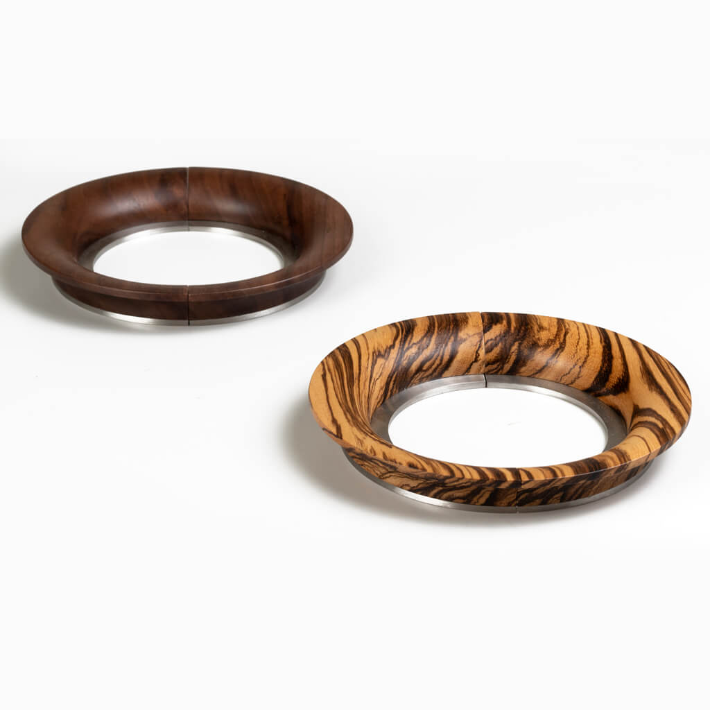The wooden profiled handle is made from premium wood species — American walnut, zebrawood, wenge, and rosewood.