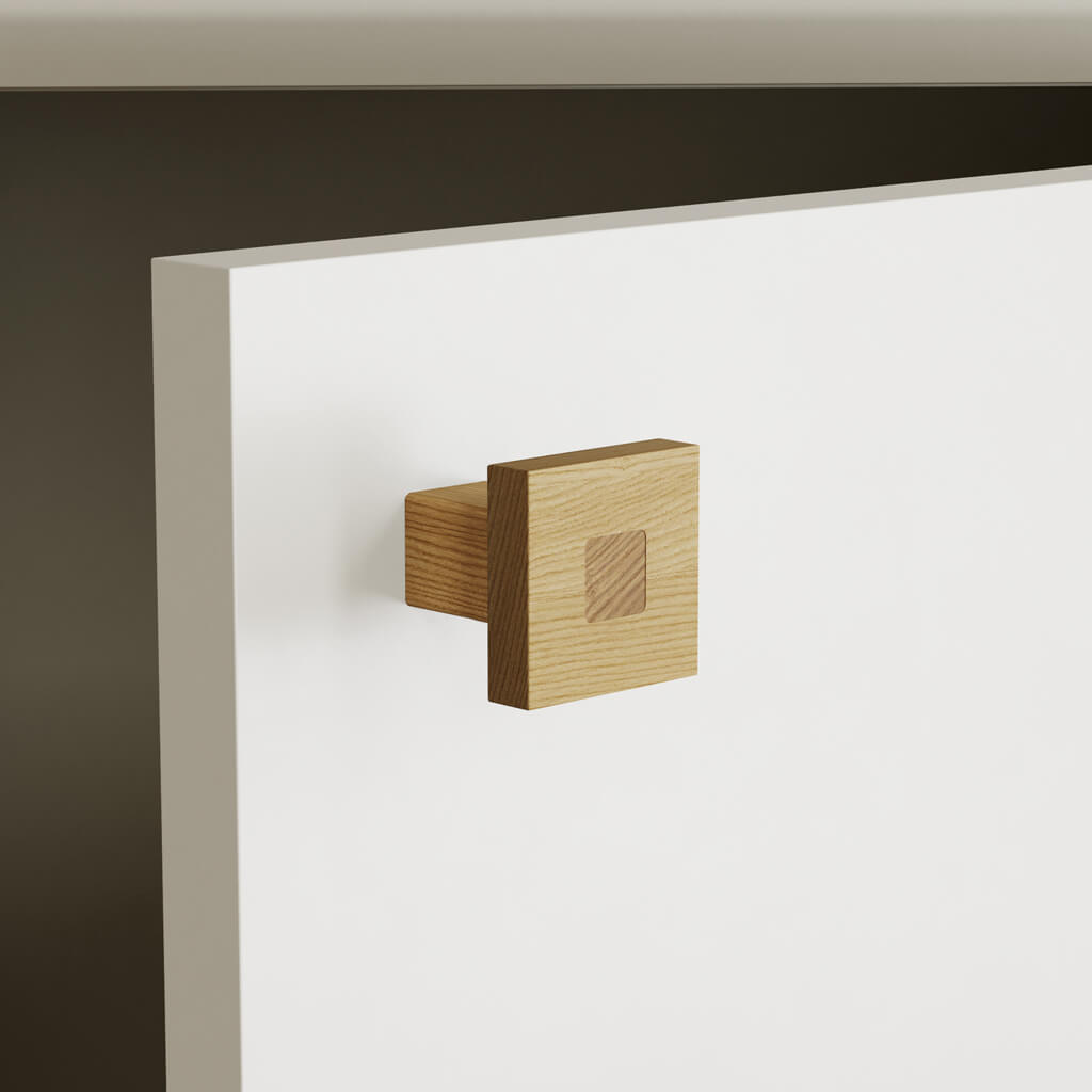 The furniture handle Proun HL-053-1M is stylish and durable Wooden Handle, made from solid oak or beech. These materials are known for their durability and resistance to wear, making them an ideal choice for creating high-quality furniture elements. The handle's design combines elements of minimalism and constructivism, which is evident in its clear geometric forms and contrasting textures.