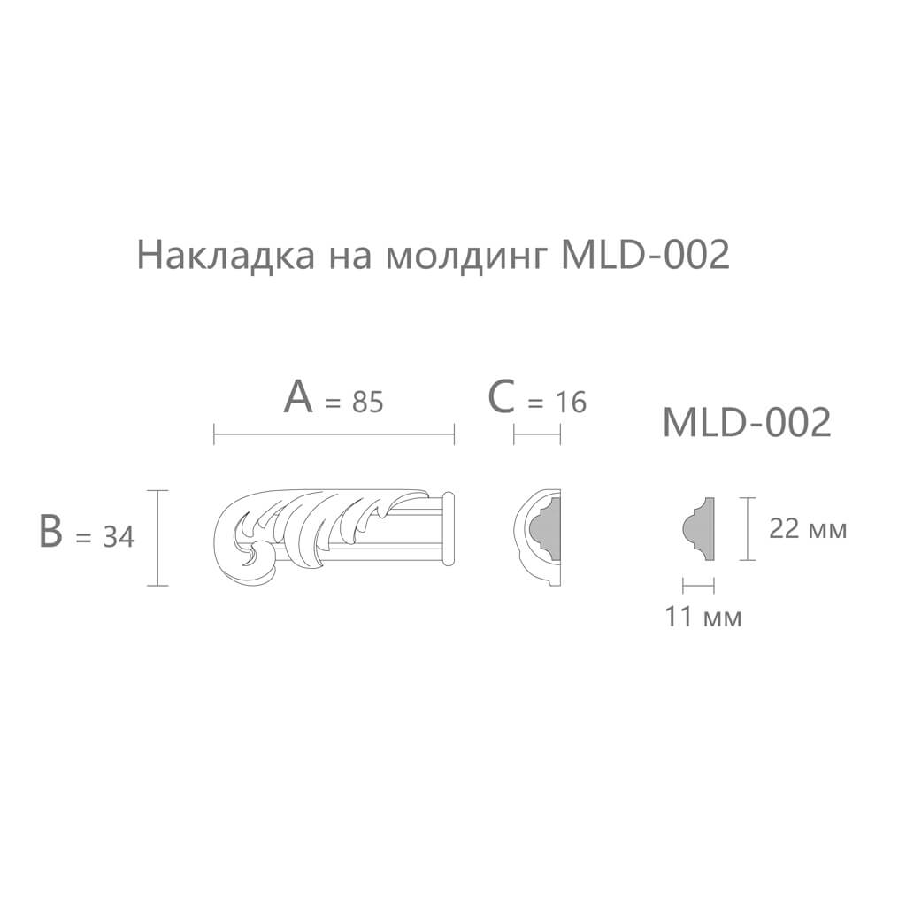 34 mm — width. This parameter corresponds to the cross-sectional width of the MLD-002 molding. The finial precisely covers the end plane in width without lateral protrusion or overhanging edges. This ensures a neat, flush transition along the width of the profile.