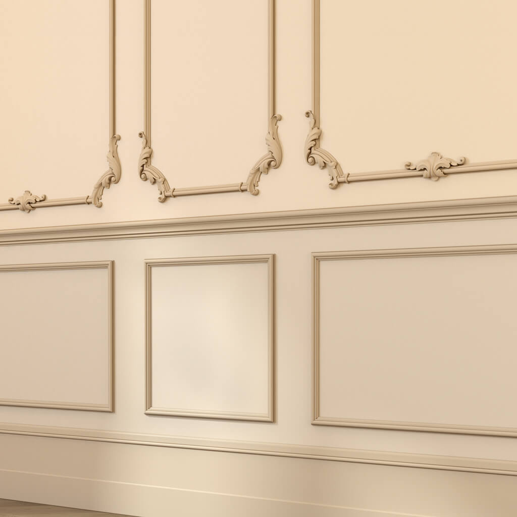 Wooden molding MLD-004, applied to the wall surface to form rectangular frame-like "fields," creates architectural relief on the wall—rhythm, depth, and a classic character. The left corner elements MLD-4U-2.1L in such wall layout occupy the left corners of each frame cell.