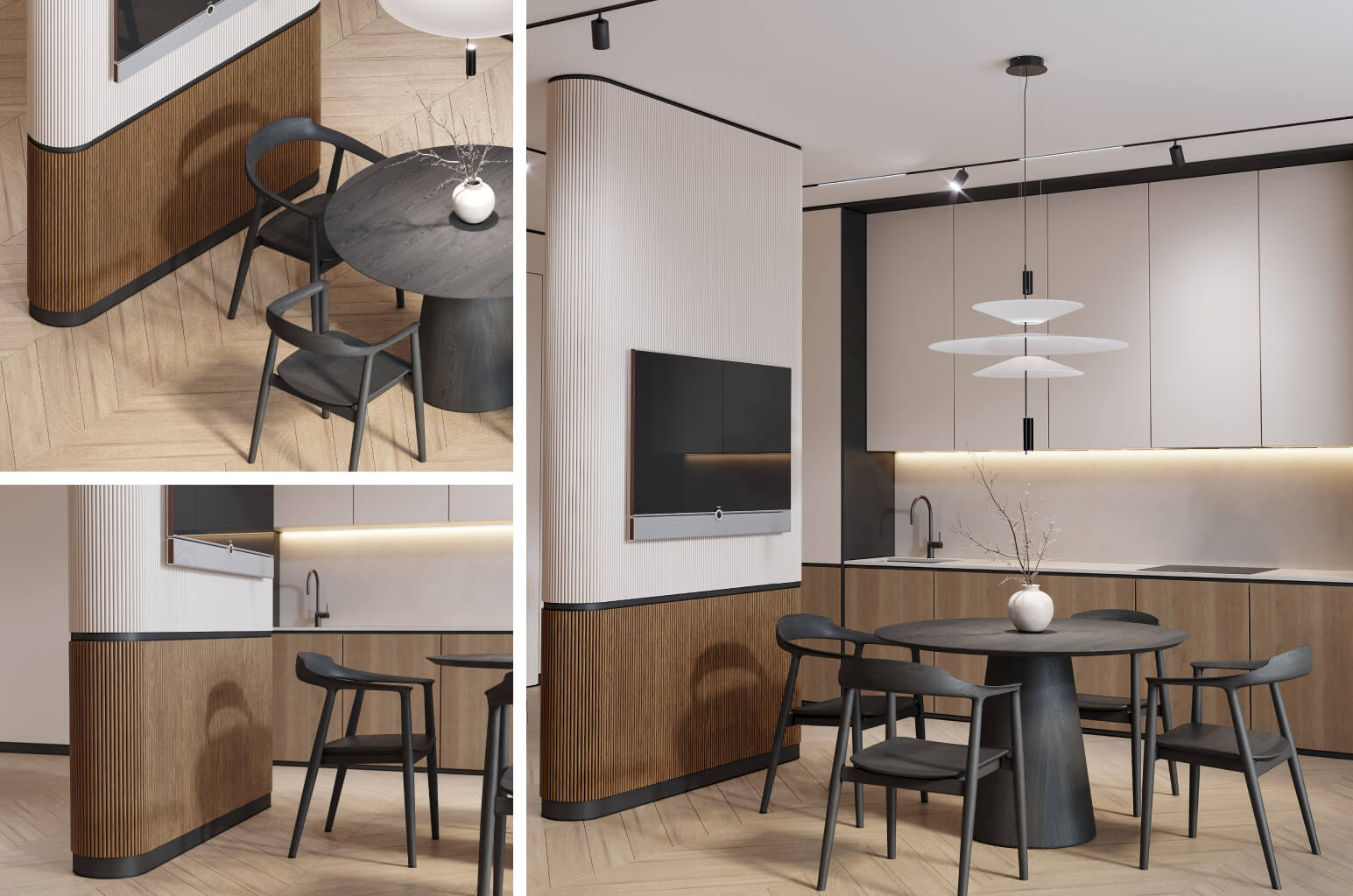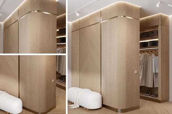 Vertical orientation of the slats is the most popular solution. It visually elongates the room in height, creating a sense of high ceilings and spacious volume. This is especially important for apartments with standard ceiling heights of 2.5–2.7 m, where any vertical accent technique radically changes the perception of space. Horizontal slats, on the contrary, visually widen the room — this option is often chosen for narrow corridors and elongated rooms.