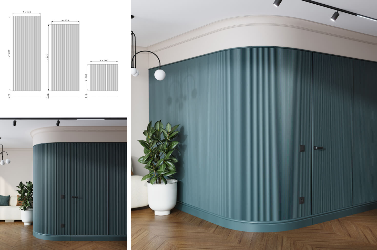 Flexible slatted panels on a fabric backing — an innovative solution for radius surfaces: columns, arches, rounded corners, curved furniture fronts. The panels follow any curve without deformation of the slats and join seamlessly.