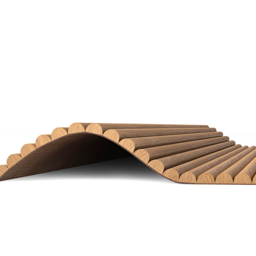Slatted panels made of semi-round battens glued onto a durable fabric base. Thanks to their flexibility, they perfectly follow any curves and complex shapes, and the modules easily connect to each other, forming a seamless surface.