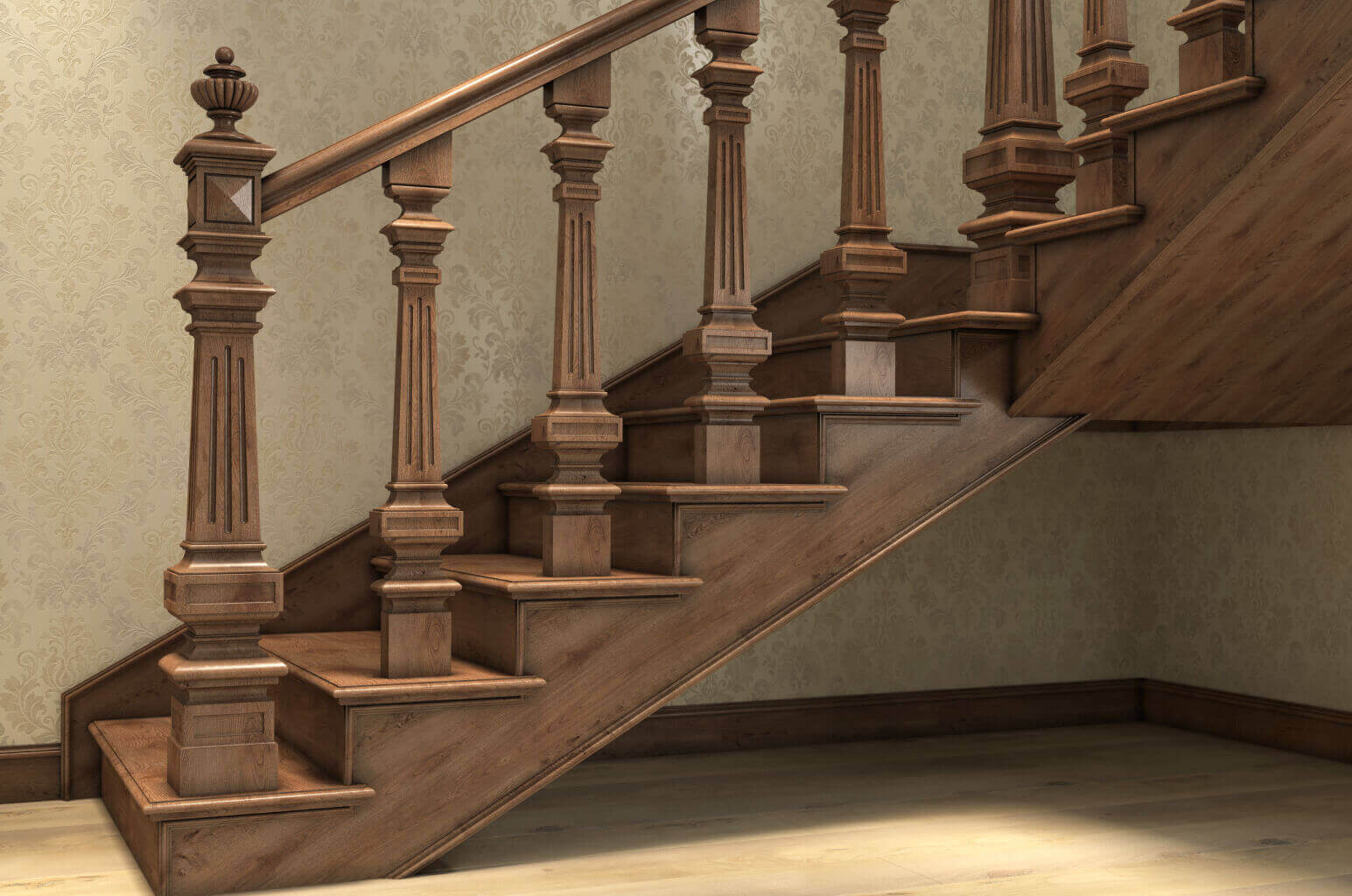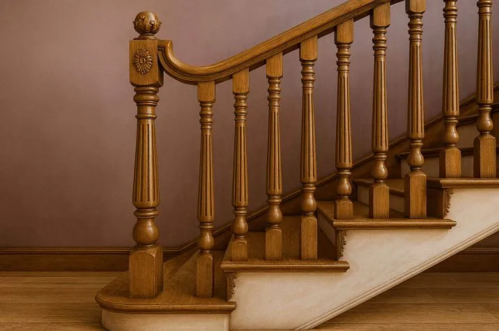 ● Handrails — these are horizontal rails that serve to hold your hand while ascending or descending the staircase. Handrails must be comfortable, reliable, and attractive. In Stavros, you can buy handrails from solid wood in various shapes, sizes, and finishes. You can choose straight, curved, carved, turned, smooth, or fluted handrails, with or without finials.