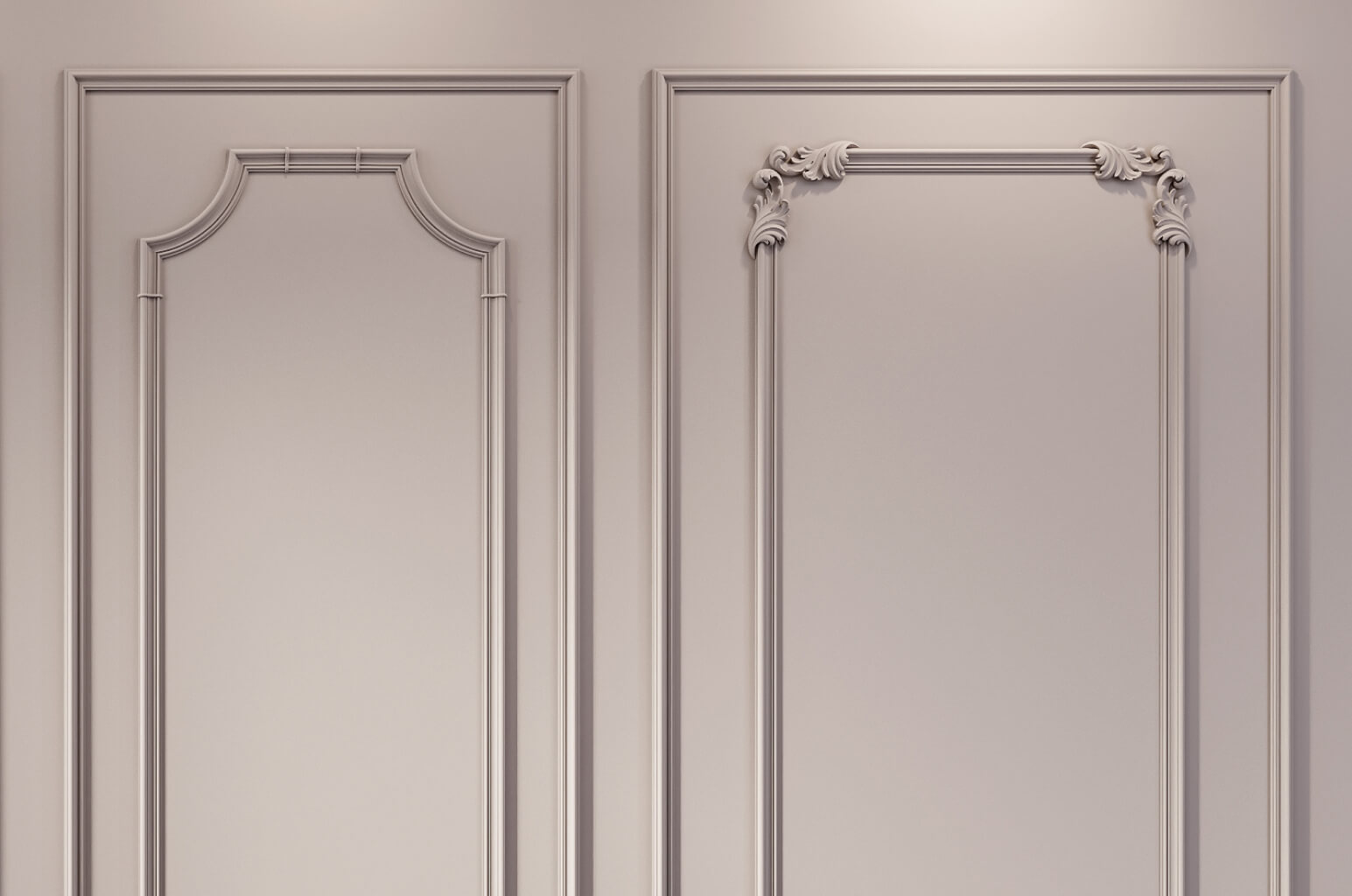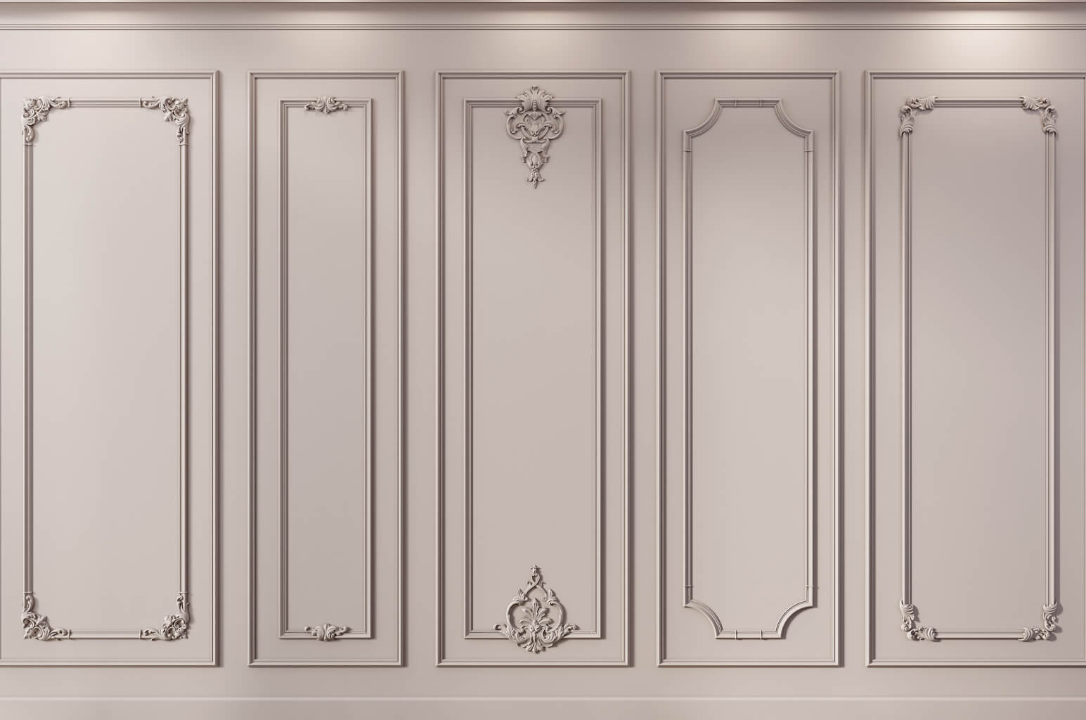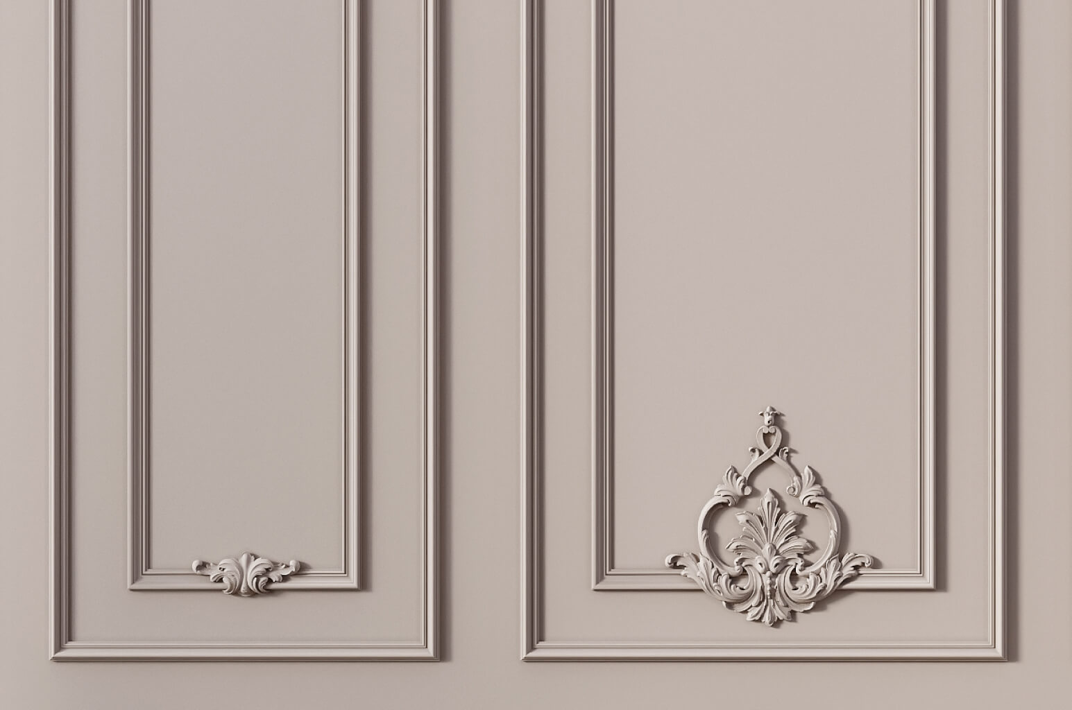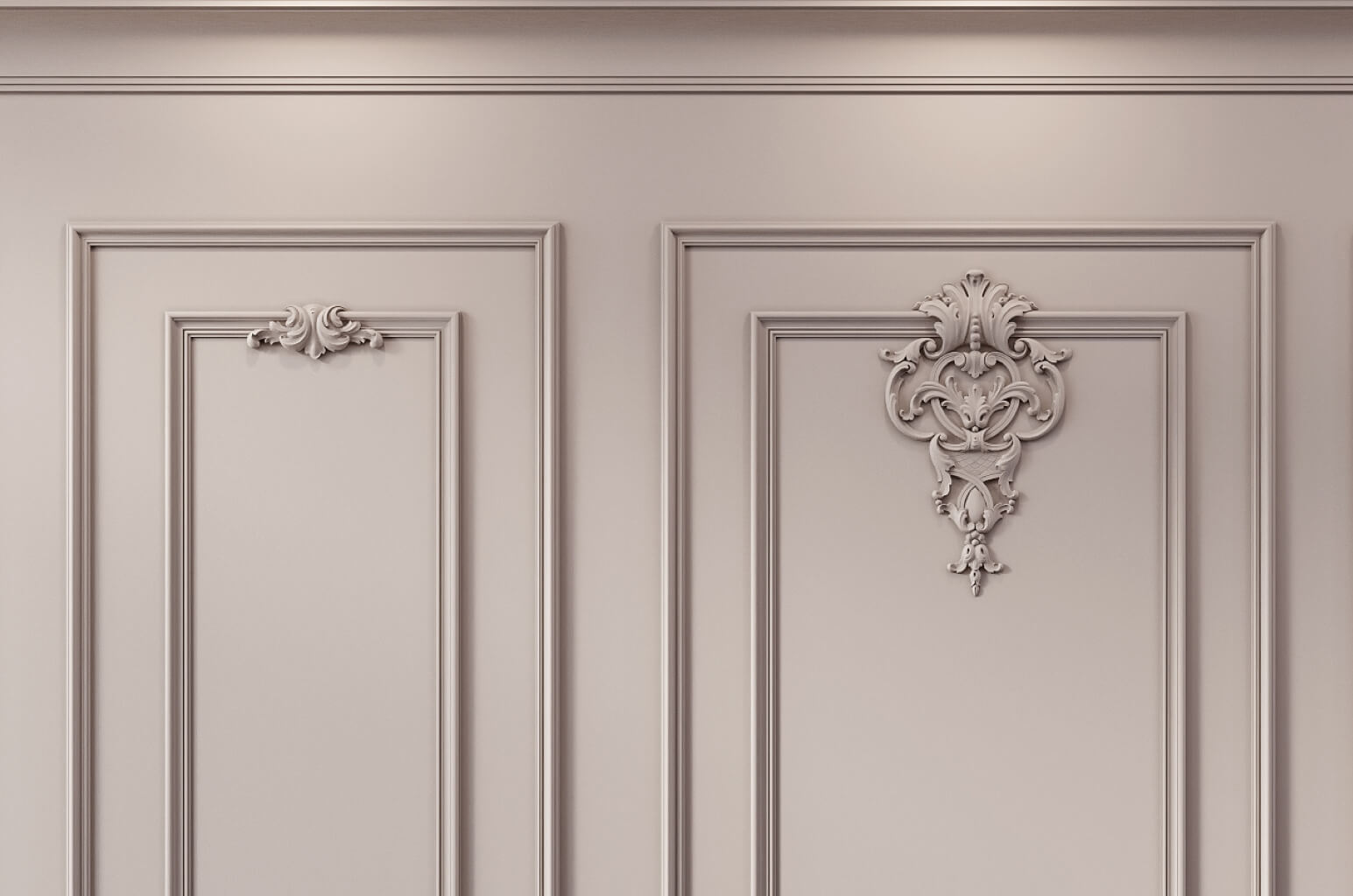 Enamel, not water-based paint. Wall panels with molding and stucco are painted with acrylic or alkyd enamel — matte or semi-matte. Water-based paint does not provide the necessary coating density on the molding: the relief is "licked" rather than painted. Enamel with good hiding pigment is the right choice formolding for painting.