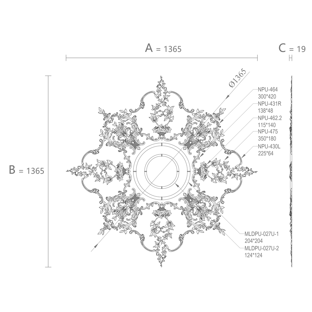 The decoration idea is based on the principle of a radial composition, where the central rosette CPU-071 with a diameter of 1365 millimeters serves as the starting point for building the entire decorative ensemble. Rays of various molding elements radiate from the center, creating a complex multi-level structure with deep relief and rich ornamentation. Eight main directions of the composition are formed using corner elements NPU-464, creating powerful Baroque accents along the diagonals and axes of the rosette.