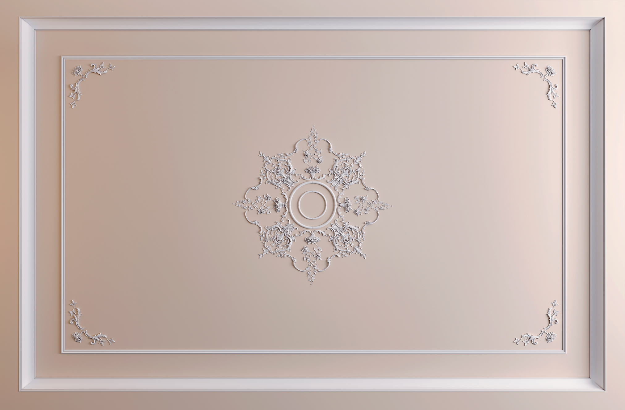 Classical white execution involves painting all elements of the composition in one tone, creating the effect of traditional plaster molding. A monochrome solution emphasizes the relief of the ornament through the play of light and shadow, creating an exquisite and elegant decor without color accents. A white composition on a light ceiling forms a subtle volumetric structure that adds depth and architectural expressiveness to the space.