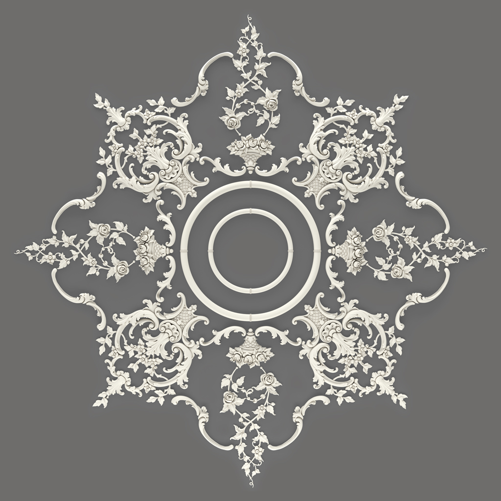 Decorative medallions MLDPU-027U of various sizes are placed at nodal points of the composition — at the intersections of axial lines, in the centers of the formed decorative sectors, in the gaps between large elements. Large medallions create secondary focal points, while small ones serve as connecting elements that ensure the visual unity of the entire composition.